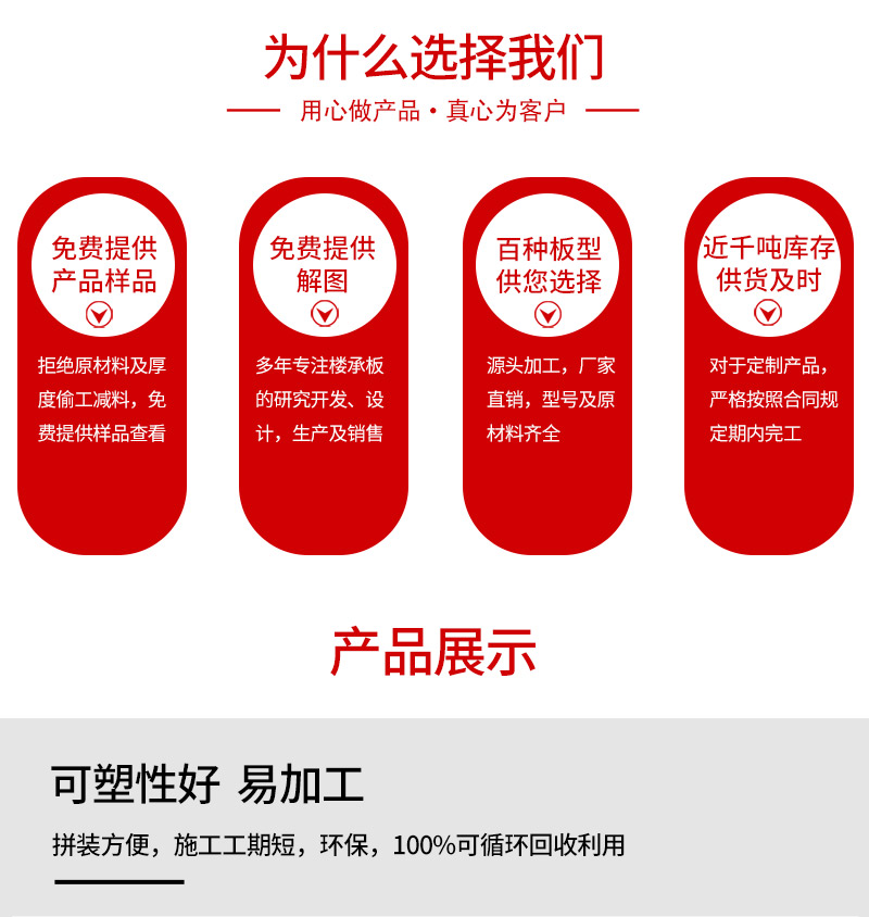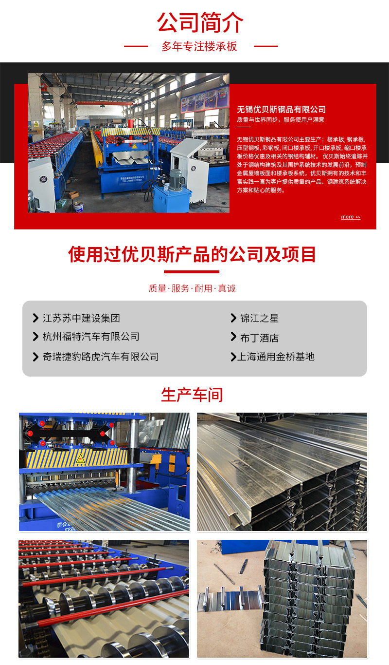 采用鍍鋅鋼板經(jīng)輥壓冷彎制作成型,施工鋪設(shè)后適于澆筑混凝土,與混凝土共同作用聯(lián)合形成一個(gè)樓面整體,是建筑鋼結(jié)構(gòu)工程中僅次于梁柱的主體部分,用于樓蓋的永久性支撐模板。